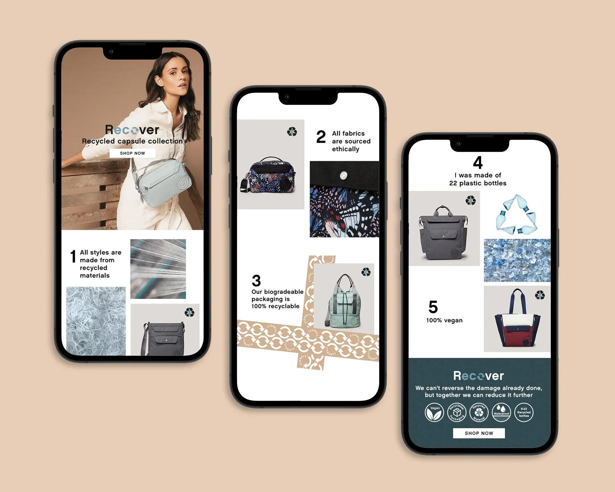 Recover is Fiorelli’s sustainable capsule collection, launched in 2020. I played a key role in shaping its brand identity and tone of voice, designing the logo, packaging, POS, product lining, and branded accessories. I also art directed both creative and campaign shoots, delivering cohesive digital assets including email campaigns, desktop and mobile visuals, social content and paid advertising.
